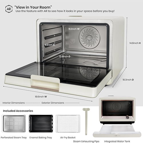 Hassle-Free Cleaning: Enjoy effortless maintenance with the oven's self-clean function, which handles deodorization, descaling, and sanitization. With a food-grade stainless steel cavity, fry basket, perforated pan, and enamel baking pan, cleaning has never been easier or more convenient.
