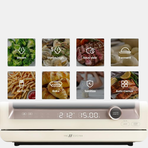 Effortless Operation: VAL CUCINA steam countertop oven featuring a user-friendly design with a 55-degree tilted, high-contrast EasyOnEye* display panel and a single EasyNavi* knob for viewing, setting, and confirming operations, along with high-decibel chord alarming to ensure you never miss a step, making cooking intuitive and stress-free.