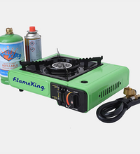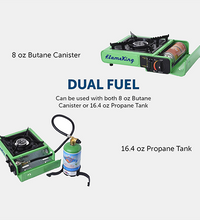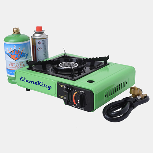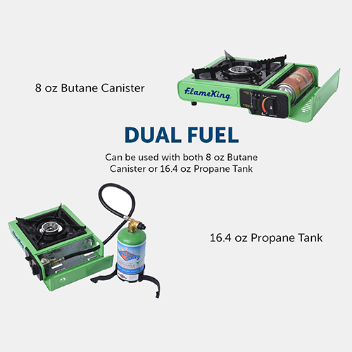 The Flame King 8,000 BTU Dual Fuel Propane Stove from Flame King is designed for stable and efficient outdoors use and is perfect for backpacking, hunting and camping trips. The stove features a 8.25"X8.25" grid for stability and comes with a wide and tip-resistant base that holds a 16.4-ounce propane gas cylinder (not included). The heat output is easy to control with an adjustable control knob so you can decide how high the flame should be. The cooking surface can accommodate pots and pans up to 10" diameter. When you are done cooking, the hose and the base separate easily from the bottle for easy and compact packing.