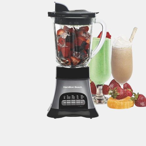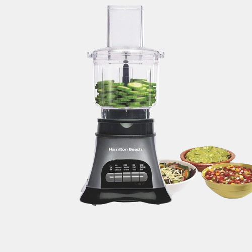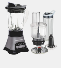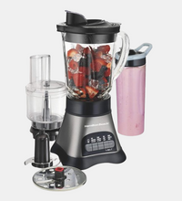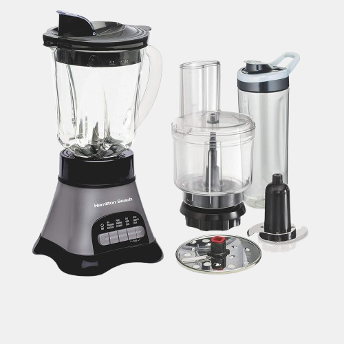 This Hamilton Beach food processor & blender system includes a 40 oz. glass jar, a 20 oz. travel jar and 3 cup chopping bowl. With 12 blending functions including pulse, you're sure to find the right setting for a smooth drink. You can also whip up sauces, dressings and purees. The patented Wave-Action(R) system on this high powered blender works to continuously pull mixture down into the blades for consistently smooth results. Additionally, the 3-cup vegetable chopper attachment makes this mixer blender multifunctional, capable of slicing, shredding, and purees. chopping. Enjoy no-mess serving with the larger jar's easy-pour spout designed to eliminate drips. The jars, lids and blades are dishwasher safe and the base comes with storage for the cord. This all-in-one food blender is perfect for everything from smoothies to salsa—serving as a powerful blender for smoothies, portable blender and a blender food processor combo that fits seamlessly into any kitchen