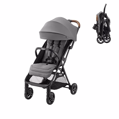 Automatically folds to a compact size with one-hand activation for multi-tasking families Travel stroller is overhead friendly so you can go more places together We recommend checking with your local airline prior to departure for specific carry-on requirements. Self-standing compact fold and ultra-lightweight at 13.2 lb, making this fully featured stroller easy to store and transport Removable belly bar that doubles as a carry handle, stylish leatherette handle, UV 50 canopy, storage basket, and parent cup holder for easy, convenient strolling All-wheel suspension, multi-position reclining seat, convertible 3- or 5-point harness with ultra-soft webbing and harness covers, and adjustable calf support for a smooth, comfortable ride for baby Accepts all Graco SnugRide ICSs to become a travel system Single-action, one-foot tap brake makes parking a breeze Stylish leatherette stroller handle ensures a smooth grip Premium, ultra-soft UV 50 canopy with visor keeps your little one shaded Multi-position reclining seat ensures baby's comfort