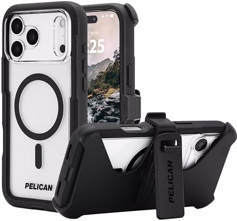Pelican Voyager iPhone 17 Pro Case [Compatible with MagSafe] Rugged Phone Case w/ 24ft Military-Grade Drop Protection - Heavy Duty Phone Cover w/Belt Clip Holster for iPhone 17 Pro - Black/Clear