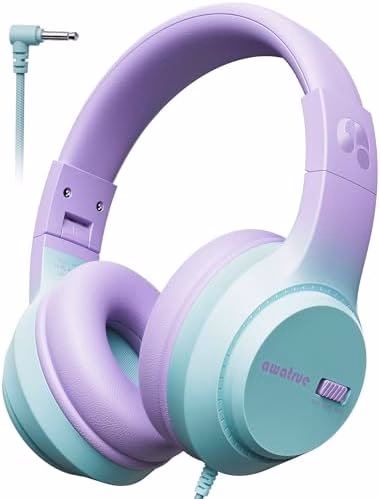 Kids Headphones, 74/85/94dB Volume Limiter, Foldable Wired Over Ear Headphones for Travel, 3.5mm Jack, Toddler Headphones for School, Chromebook, iPad, Tablet, Purple Green